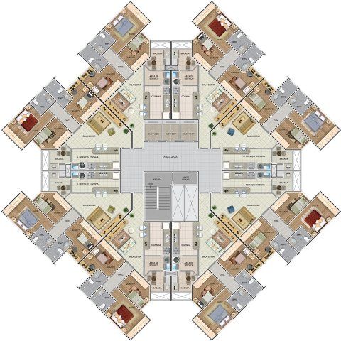 Edifício de duas torres com 19 pavimentos mais 4 subsolos, contendo no total 120 unidades residenciais.